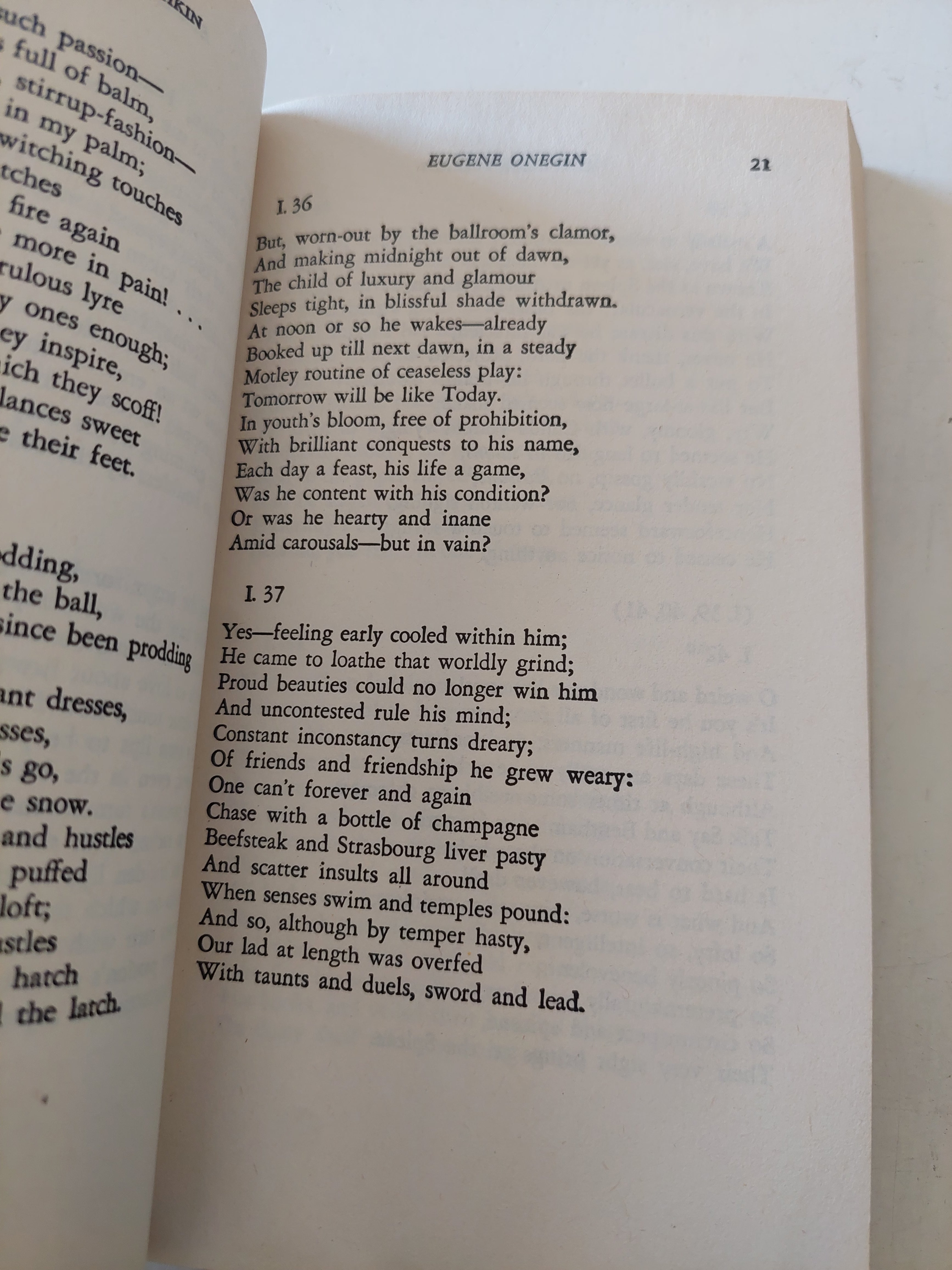 "Eugene Onegin" تُعد من أعظم الأعمال في الأدب الروسي، وهي رواية شعرية كُتبت بين عامي 1823 و1831، وتتناول قصة الشاب الأرستقراطي يفغيني أونيغين، الذي يعيش حياة تافهة خالية من المعنى، حتى يلتقي بفتاة ريفية صادقة المشاعر تدعى تاتيانا، فيرفض حبها، لتتحول القصة إلى تأمل مأساوي في الحب والندم والملل والبحث عن الذات.
