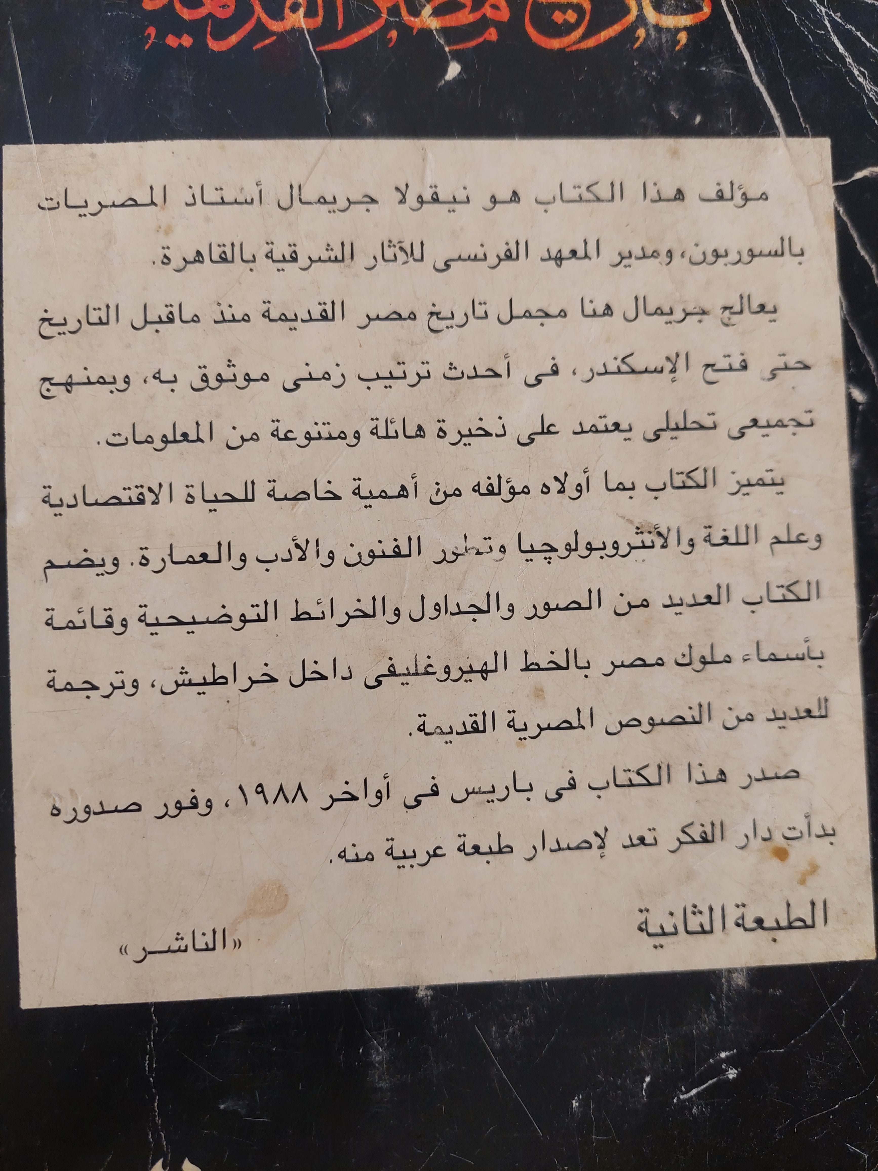 كتاب A History of Ancient Egypt لنيقولا جريمال يُعدُّ من الأعمال الرائدة في علم المصريات والتاريخ القديم؛ إذ يقدم سردًا شاملاً لتطوّر الحضارة المصرية من بدايات ما قبل التاريخ حتى الفتح الإسكندر الأكبر (حوالي 333 ق.م). اعتمد جريمال في هذا العمل على أحدث الأبحاث الأثرية والنصوص القديمة، فجمع بين الجانب المادي والمعنوي للحضارة؛ عرضًا لعواملها الطبيعية، السياسات، المعتقدات، الاقتصاد، العلاقات الخارجية، والتحولات التي مرّت بها الأقاليم المصرية عبر العصور.