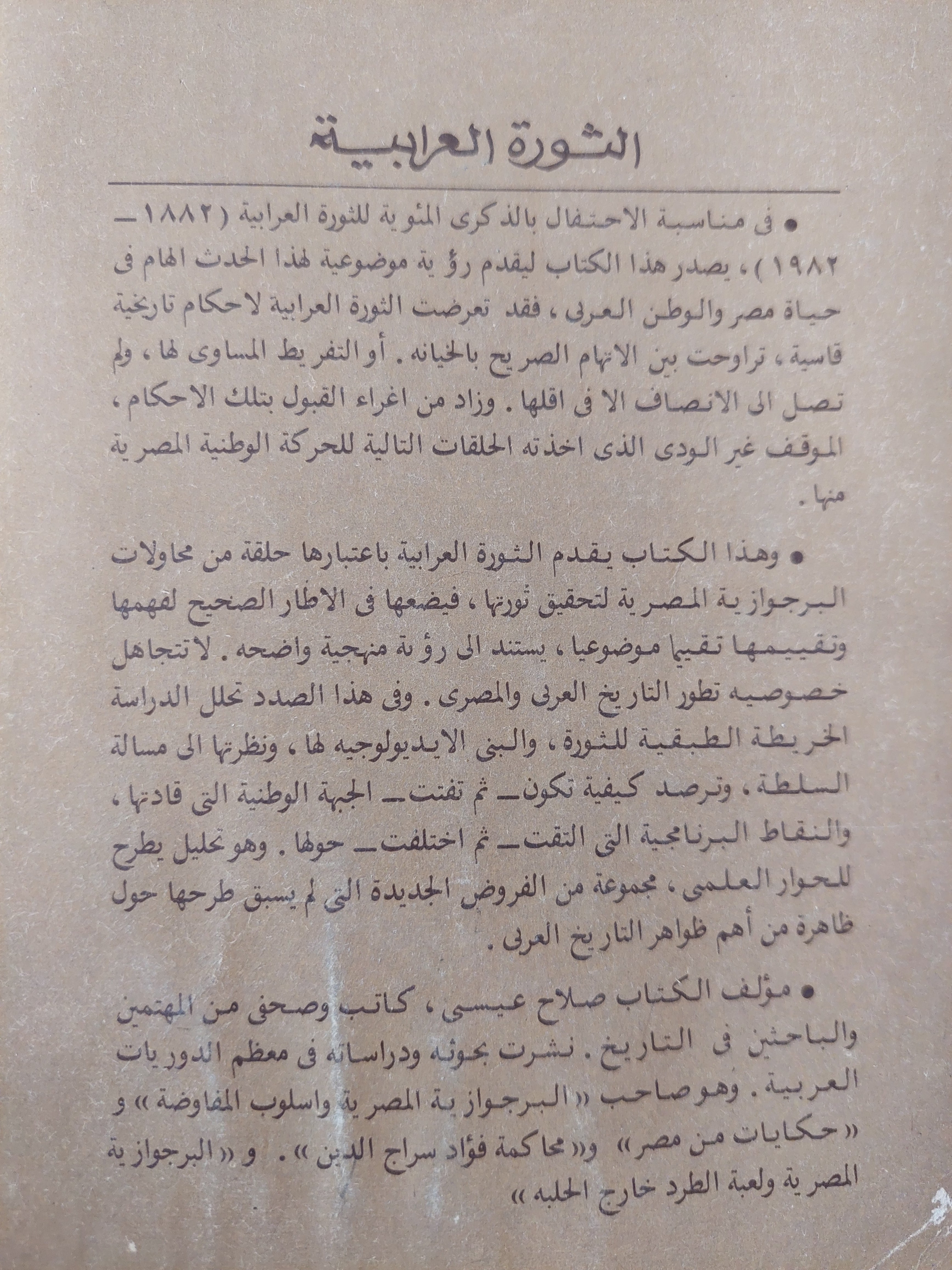 «الثورة العرابية» لصلاح عيسى هو كتاب يُعيدنا إلى جذور حركة وطنية بطلتها مصر، مكتوبة من قلب تجربة شخصية مؤثرة، بأسلوب بحثي موضوعي يعيد صياغة الثورة كحركة اجتماعية وطنية وأحداثاً متراكبة الأبعاد.