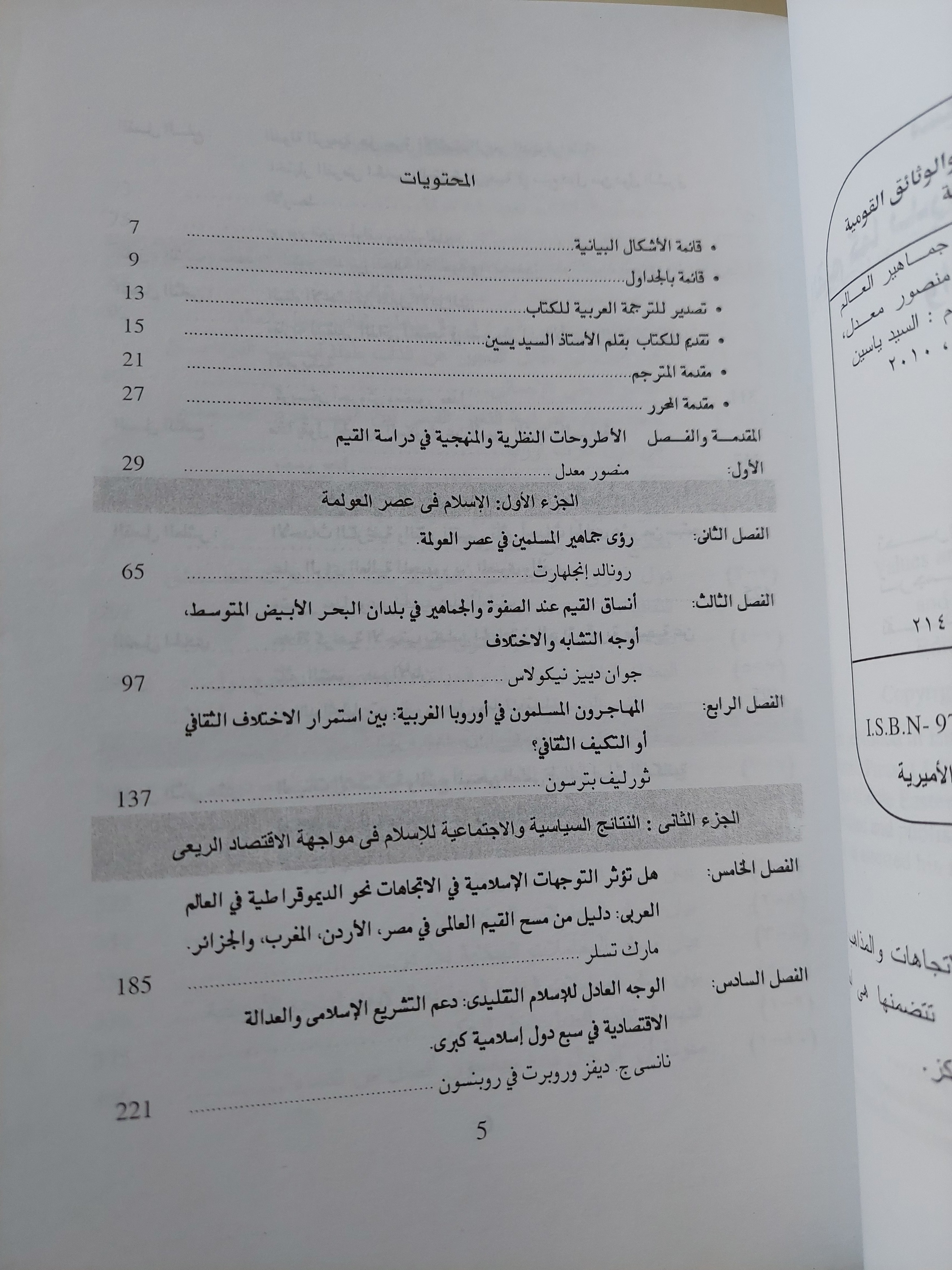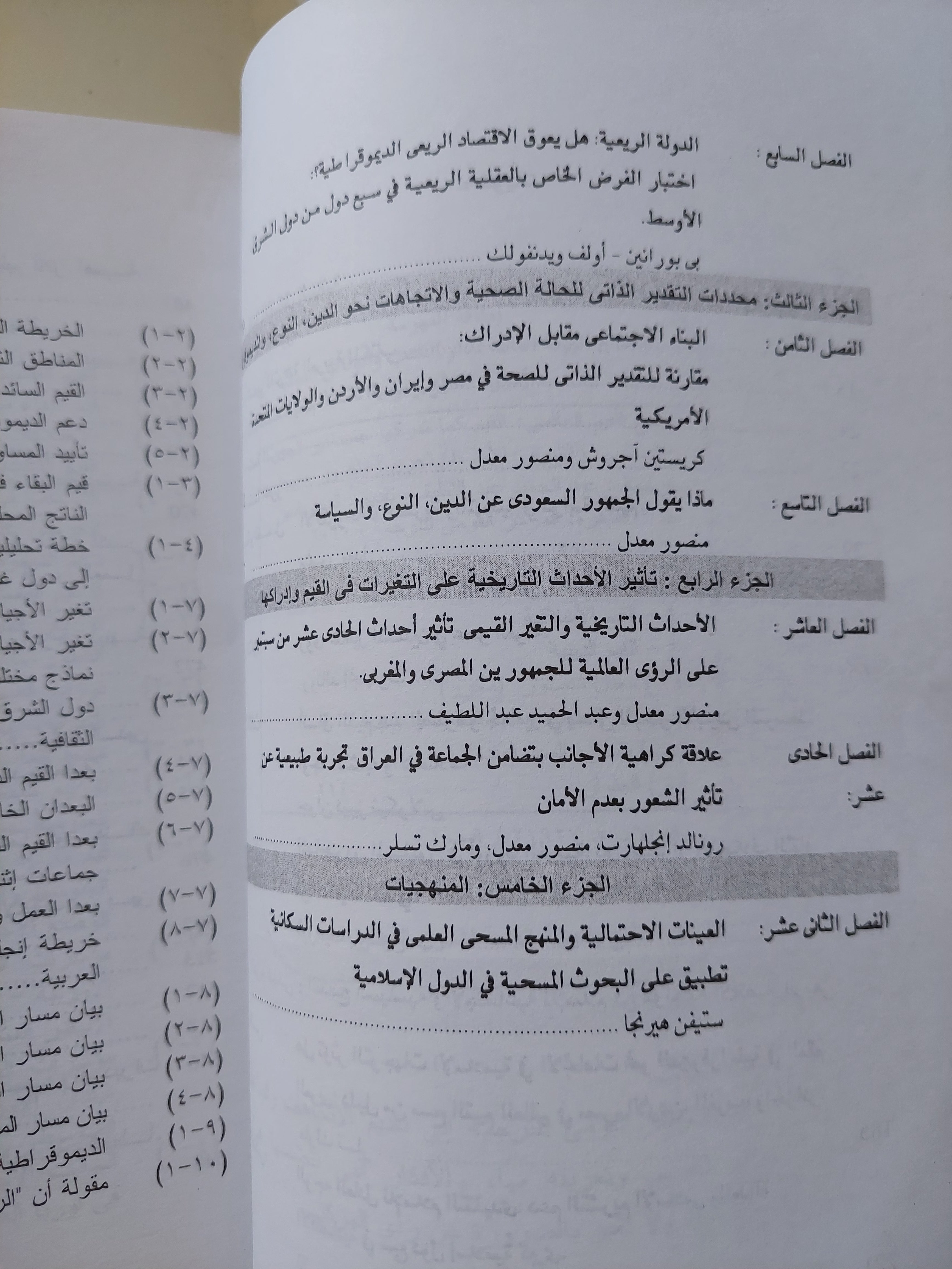 يعرض الدكتور منصور معدل من خلال هذا الكتاب نتائج المسوح الميدانية التي أجريت في عدد من الدول العربية، محلّلًا اتجاهات القيم المتعلقة بالدين، والسياسة، والعمل، والأسرة، والتعليم، والمواطنة، والمساواة بين الجنسين، والهوية الثقافية. كما يقارن بين هذه القيم ونظيراتها في المجتمعات الغربية والآسيوية، في محاولة لفهم موقع العالم العربي في خريطة التحولات القيمية العالمية.