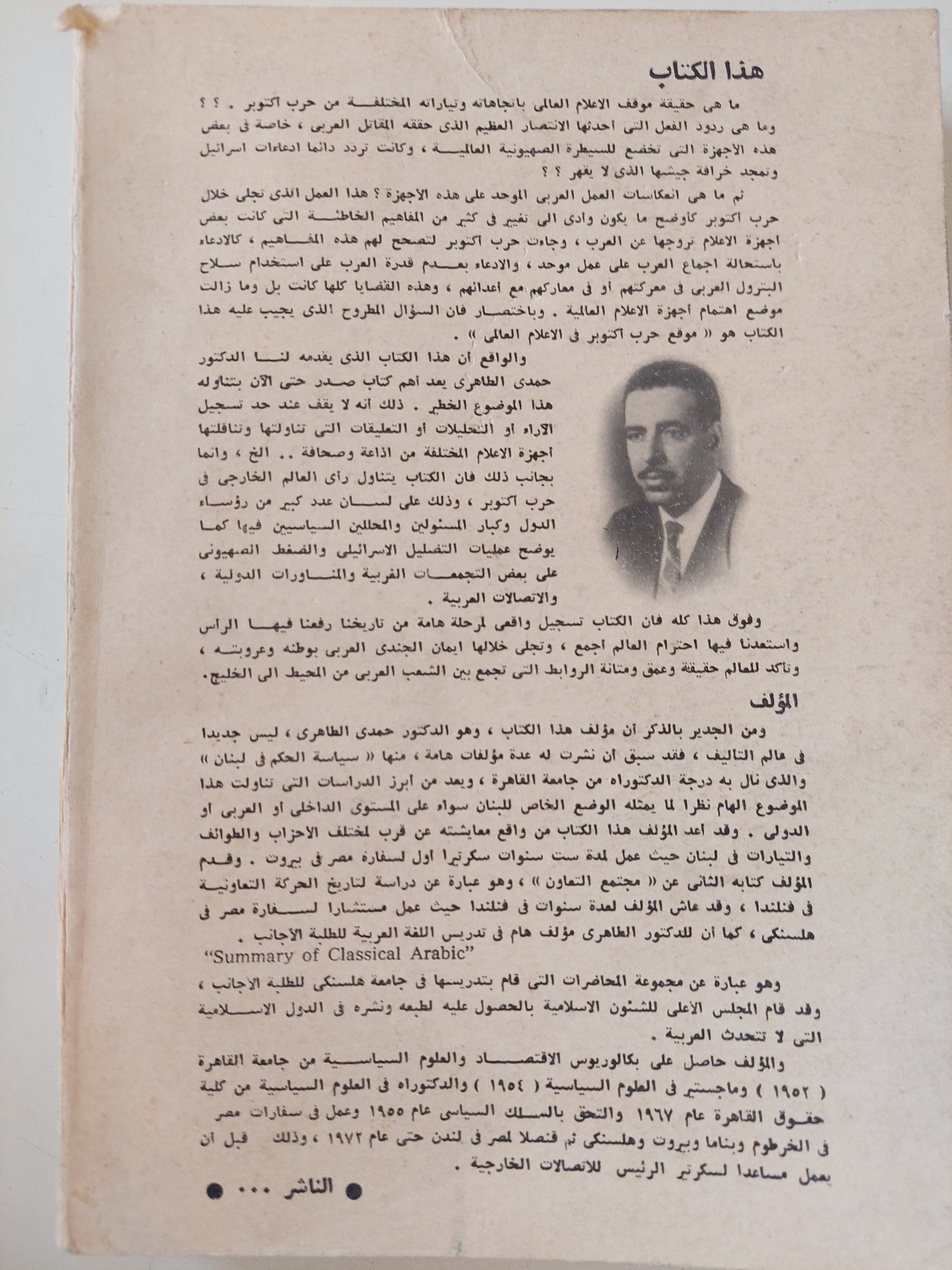 يُقدّم هذا العمل وثيقة تحليلية رصينة حول كيفية تغطية الرأي العام ووسائل الإعلام العالميّة لـ حرب أكتوبر عام 1973. يبدأ المؤلّف باسترجاع سياق الثورة المصرية في 23 يوليو 1952 وما تلاها من تغيُّرات سياسية وإعلامية، ليصل إلى اللحظة المفصليّة التي دخلت فيها الحرب مصافّ الحدث الدولي. يُحلّل الطاهري كيف واجهت مصر والجبهة العربية تحدّي الدعاية المعادية، وكيف حرصت على نشر روايتها عبر الصحافة، الإذاعة، والتلفزيون، وصولًا إلى التوجيه الإعلامي الدولي. يستعرض الكتاب استراتيجيات الإعلام العسكري، التلاعب بالمعلومة، وأثر ذلك على مواقف الدول والشعوب الأجنبية، خصوصًا في أوروبا وأميركا. كما يُبرز المؤلّف كيف أدّت تغطيات الحرب إلى تغيير مفهوم «العدو» و«الحليف» في الإعلام الغربي، وإلى تحول في موازين التأييد أو التحيّز العالمي. يعتبر هذا العمل مرجعاً ثميناً لفهم البُعد الإعلامي للحرب، ويخدم الباحثين في الإعلام، العلاقات الدولية، والدراسات التاريخية التي تُعنى بالصراع العربي-الإسرائيلي.