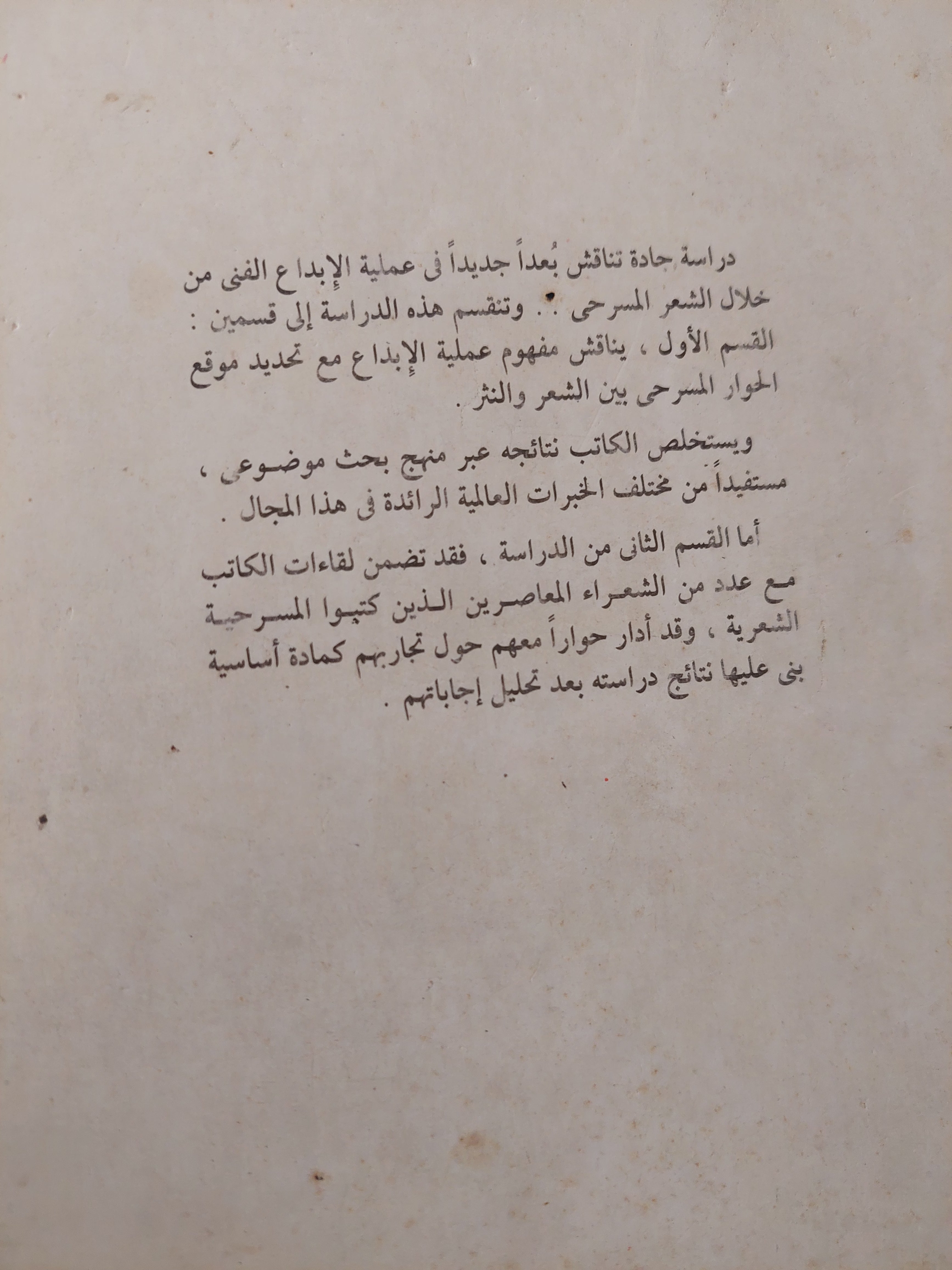 القسم الأول: يستعرض مفهوم عملية الإبداع، مع تحديد موقع الحوار المسرحي بين الشعر والنثر. يعتمد الكاتب على منهج بحث موضوعي، مستفيدًا من الخبرات العالمية الرائدة في هذا المجال.