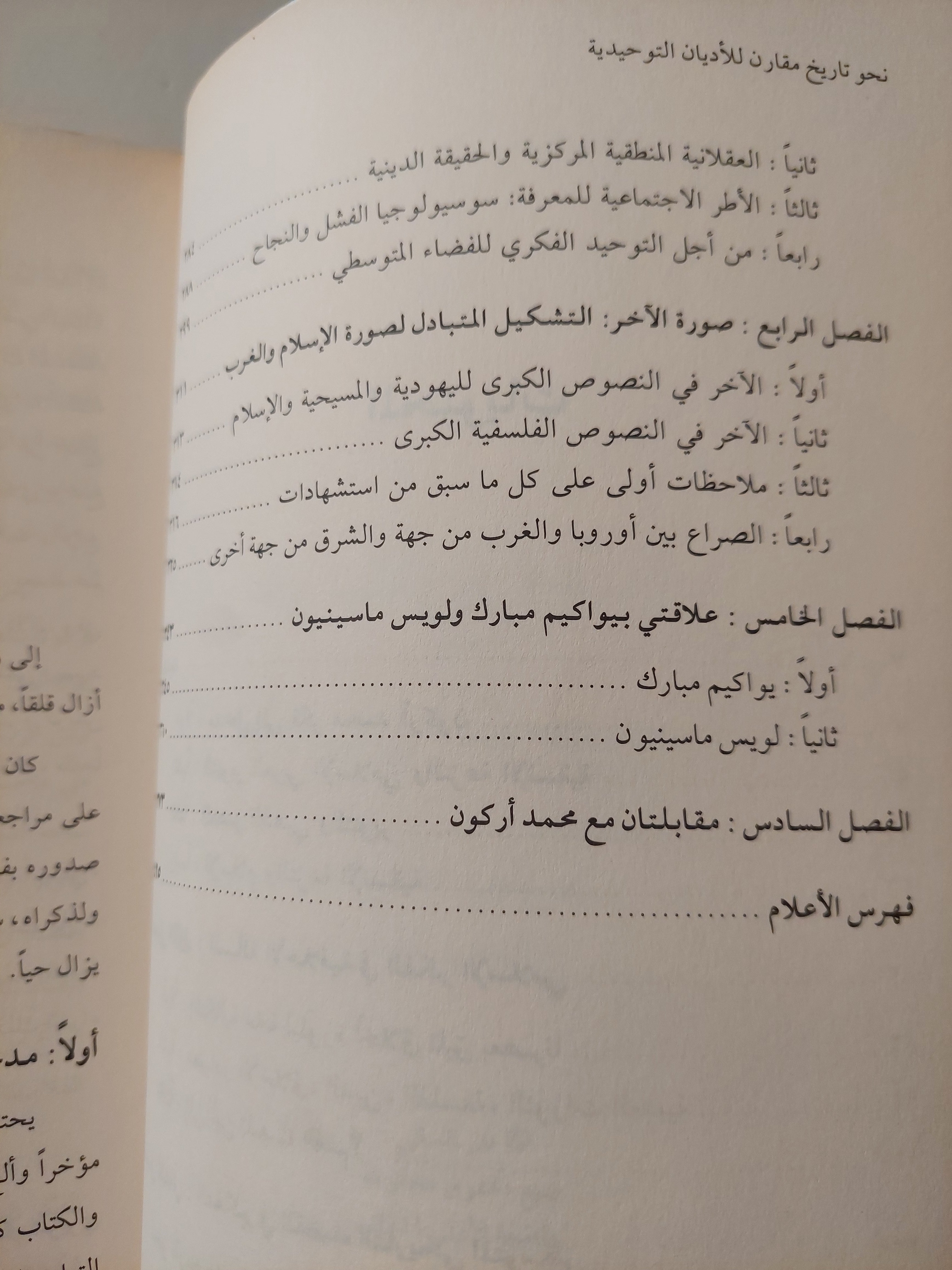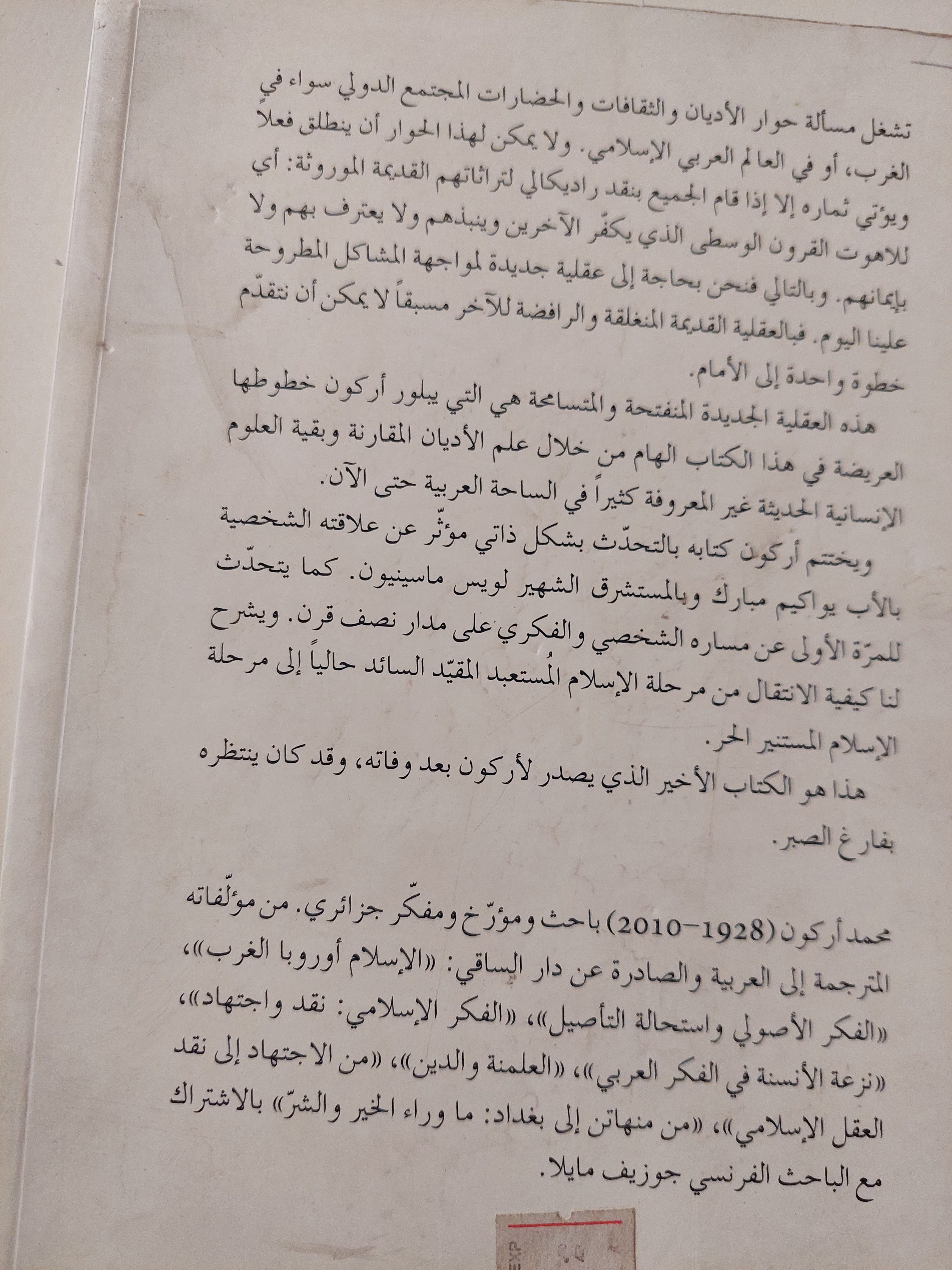 ويختتم أركون كتابه بالتحدّث بشكل ذاتي مؤثّر عن علاقته الشخصية بالأب يواكيم مبارك وبالمستشرق الشهير لويس ماسينيون، كما يتحدّث للمرّة الأولى عن مساره الشخصي والفكري على مدار نصف قرن، ويشرح لنا كيفية الإنتقال من مرحلة الإسلام المُستعبد المقيّد السائد حالياً إلى مرحلة الإسلام المستنير الحر.