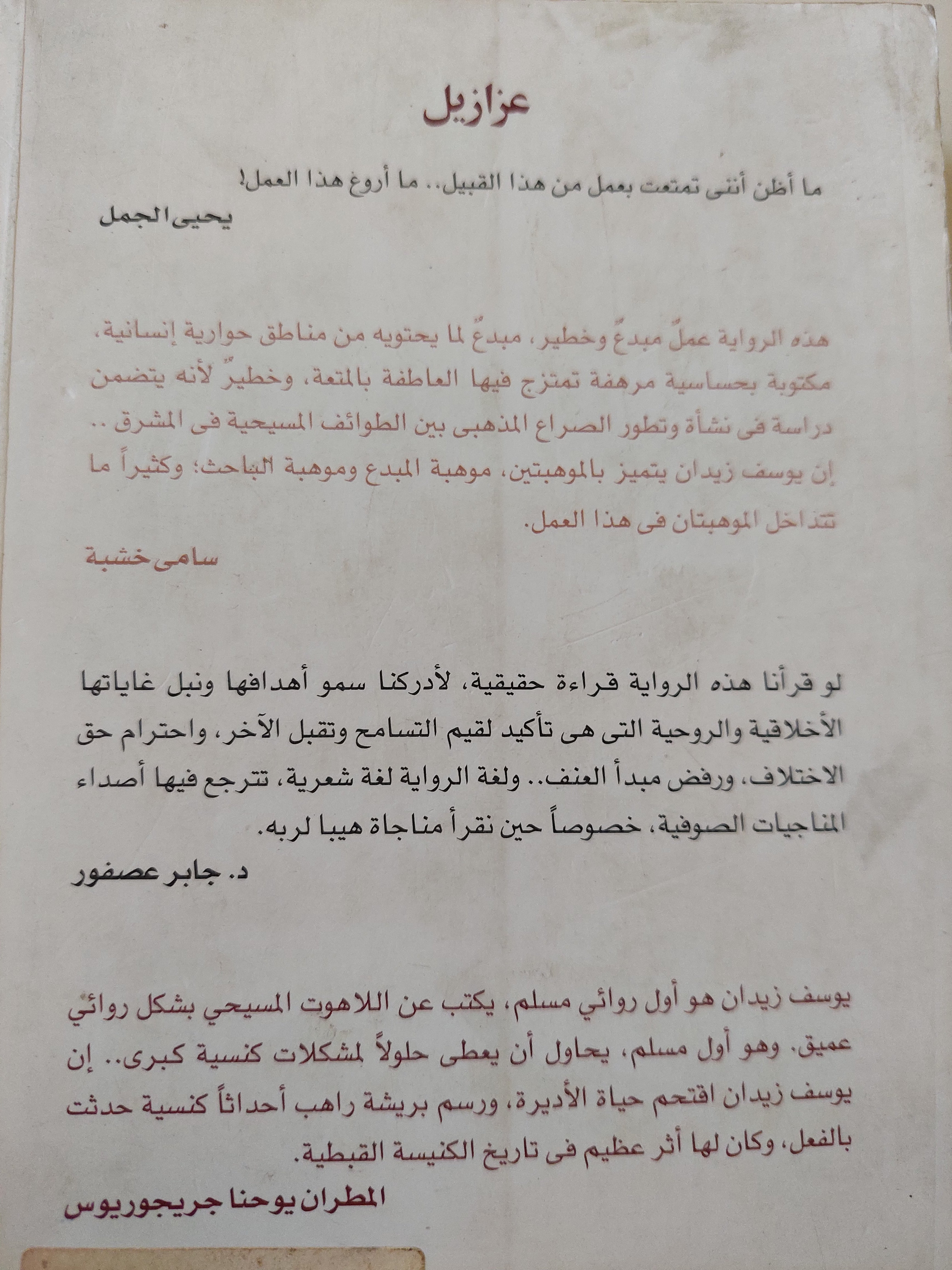 رواية «عزازيل» للكاتب والمفكر المصري يوسف زيدان تُعد من أبرز الروايات العربية في القرن الحادي والعشرين، وقد حصلت على الجائزة العالمية للرواية العربية (البوكر العربية) عام 2009، كما أُدرجت ضمن قائمة أكثر الكتب مبيعًا في الوطن العربي لسنوات متتالية.