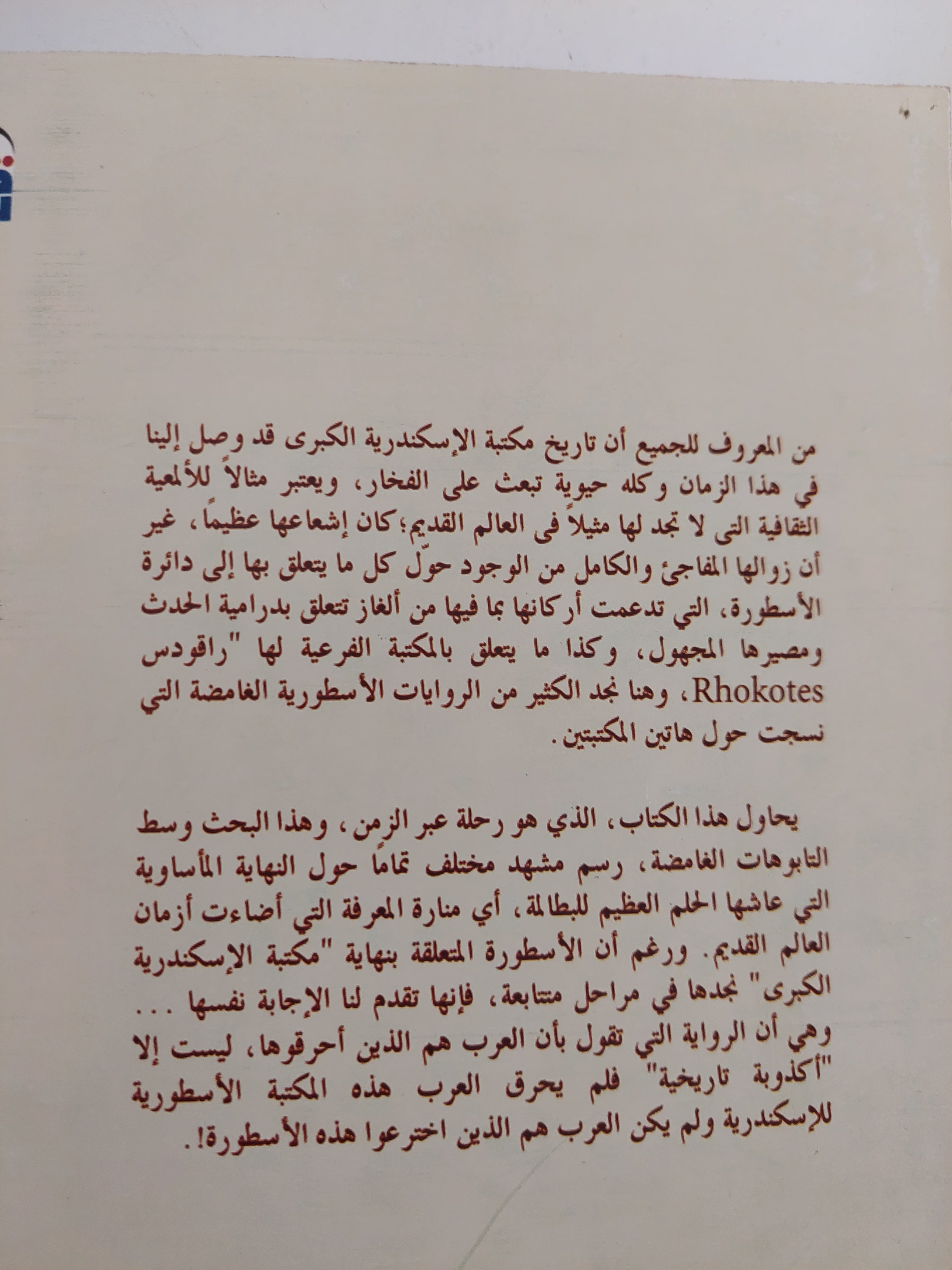 يعرض الكتاب رحلة عميقة عبر الزمن لكشف الغموض والأساطير المحيطة بمكتبة الإسكندرية الكبرى، تلك المنارة الفريدة للمعرفة في العصور القديمة، التي لعبت دوراً ثقافيًا وتاريخيًا أسطوريًا، حتى اختفت فجأة من الوجود وبدأ حولها نموذج الأسطورة
