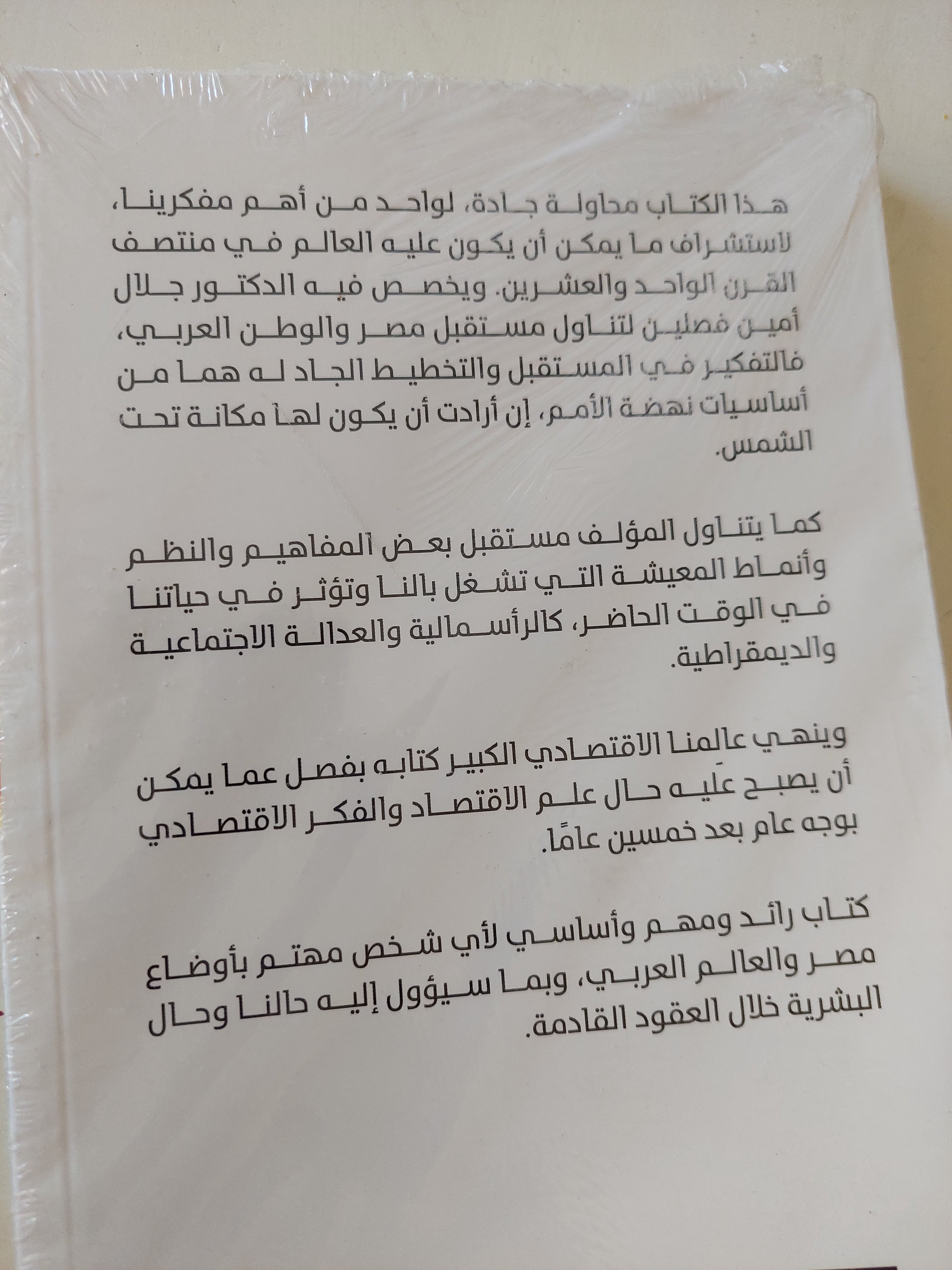 هذا الكتاب محاولة جادة، لواحد من أهم مفكرينا، لاستشراف ما يمكن أن يكون عليه العالم في منتصف القرن الواحد والعشرين. ويخصص فيه الدكتور جلال أمين فصلين لتناول مستقبل مصر والوطن العربي، فالتفكير في المستقبل والتخطيط الجاد له هما من أساسيات نهضة الأمم، إن أرادت أن يكون لها مكانة تحت الشمس.