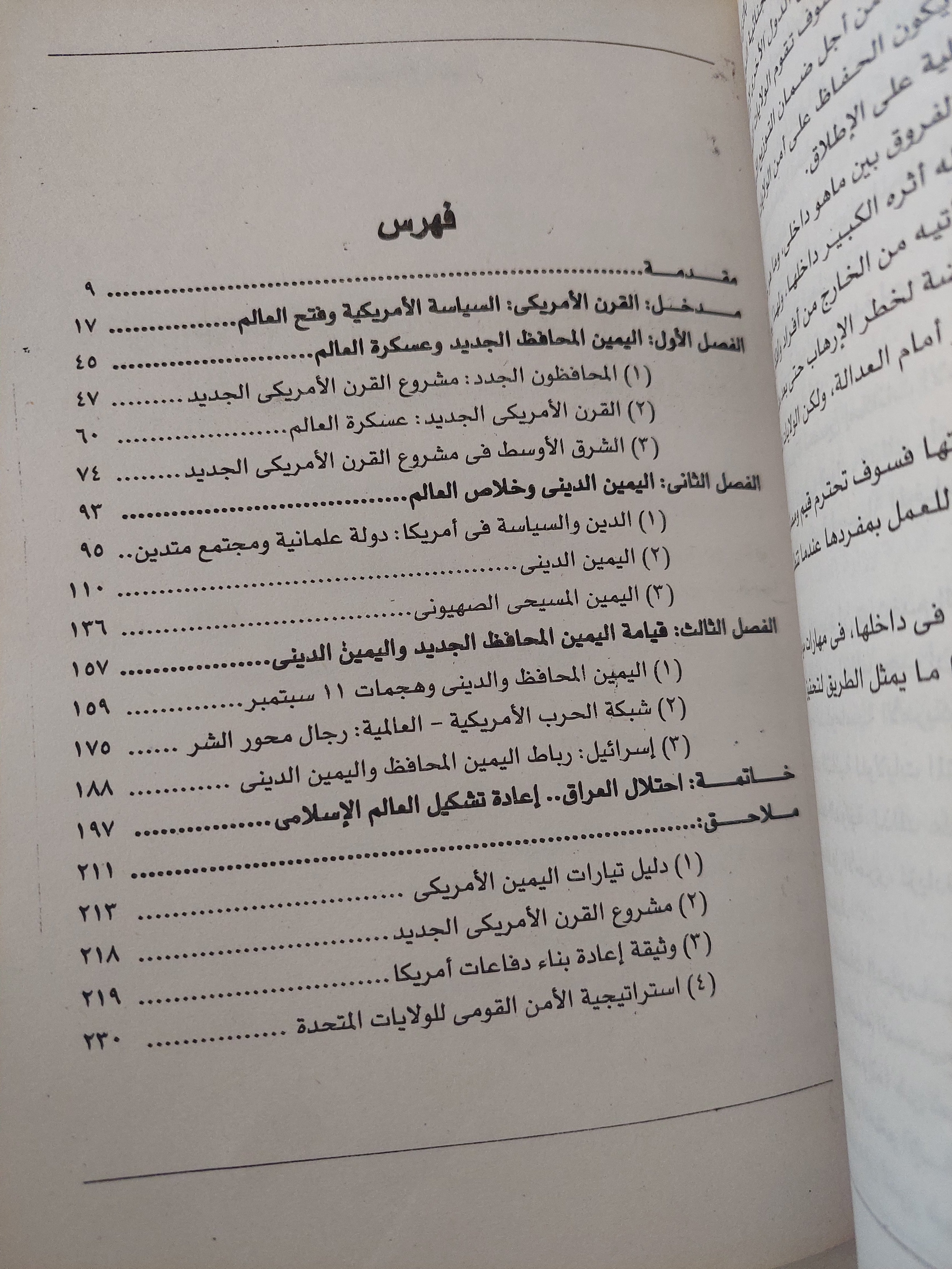 يستعرض رضا هلال في هذا الكتاب جذور الفكر المحافظ الجديد في التاريخ الأمريكي، بدءًا من تأثير الفلاسفة السياسيين في القرن العشرين، مثل ليو شتراوس، إلى كيفية تحوّل هذا التيار إلى قوة مؤثرة في الإدارة الأمريكية، خصوصًا خلال حكم جورج بوش الابن. كما يربط المؤلف بين الخطاب الديني المسيحي الصهيوني وبين مفهوم “الحرب المقدسة”، موضحًا كيف تم توظيف الدين لتبرير السياسات التوسعية تحت شعار “نشر الديمقراطية”.