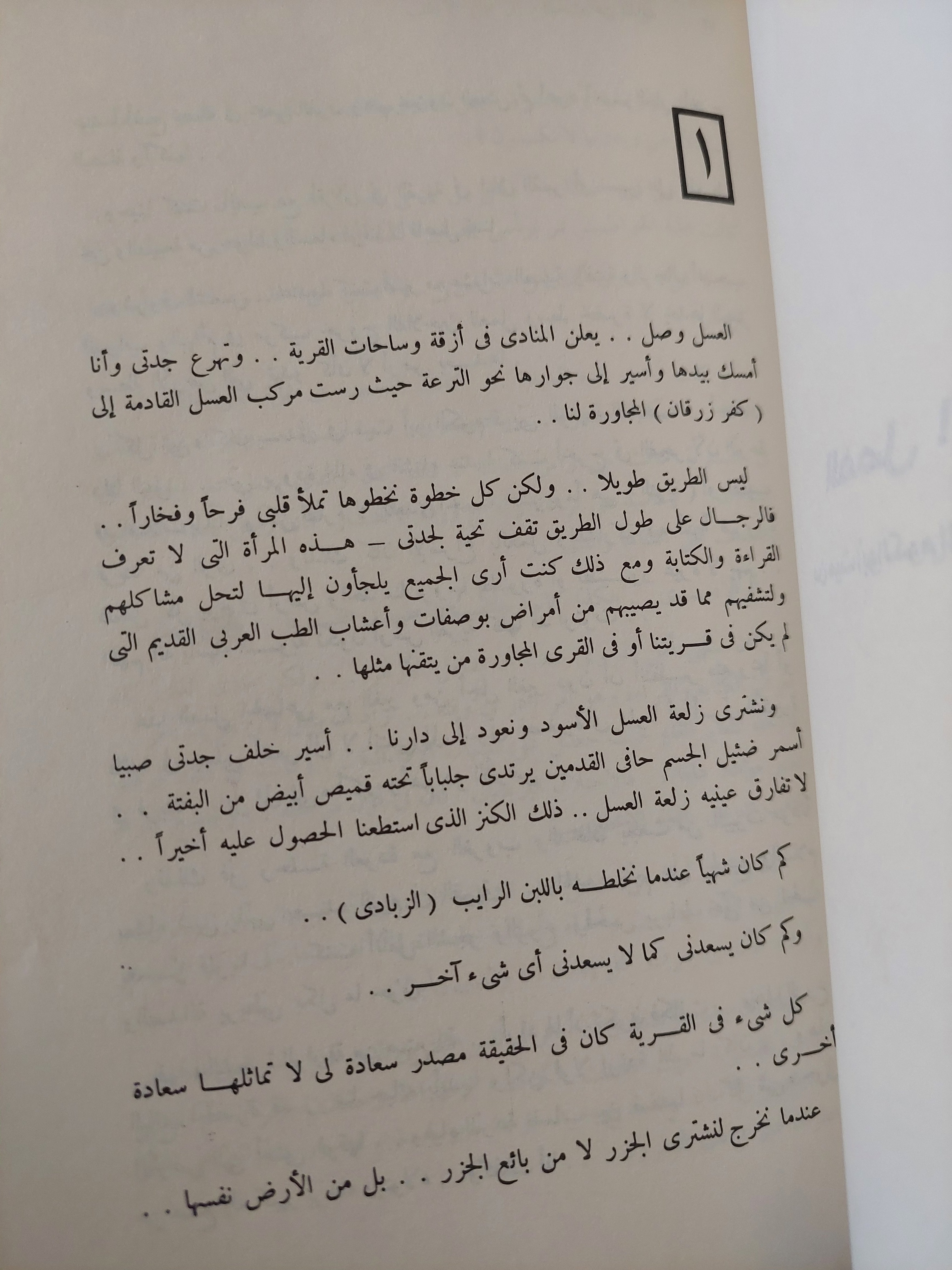 يبدأ الكتاب بوصف طفولته في الريف المصري، ويصف لحظات مبكرة مثل لحظة وصول «العسل» إلى الأزقة وساحات القرية، وهو مشهد يعكس الجغرافيا والزمان الذي نشأ فيه.