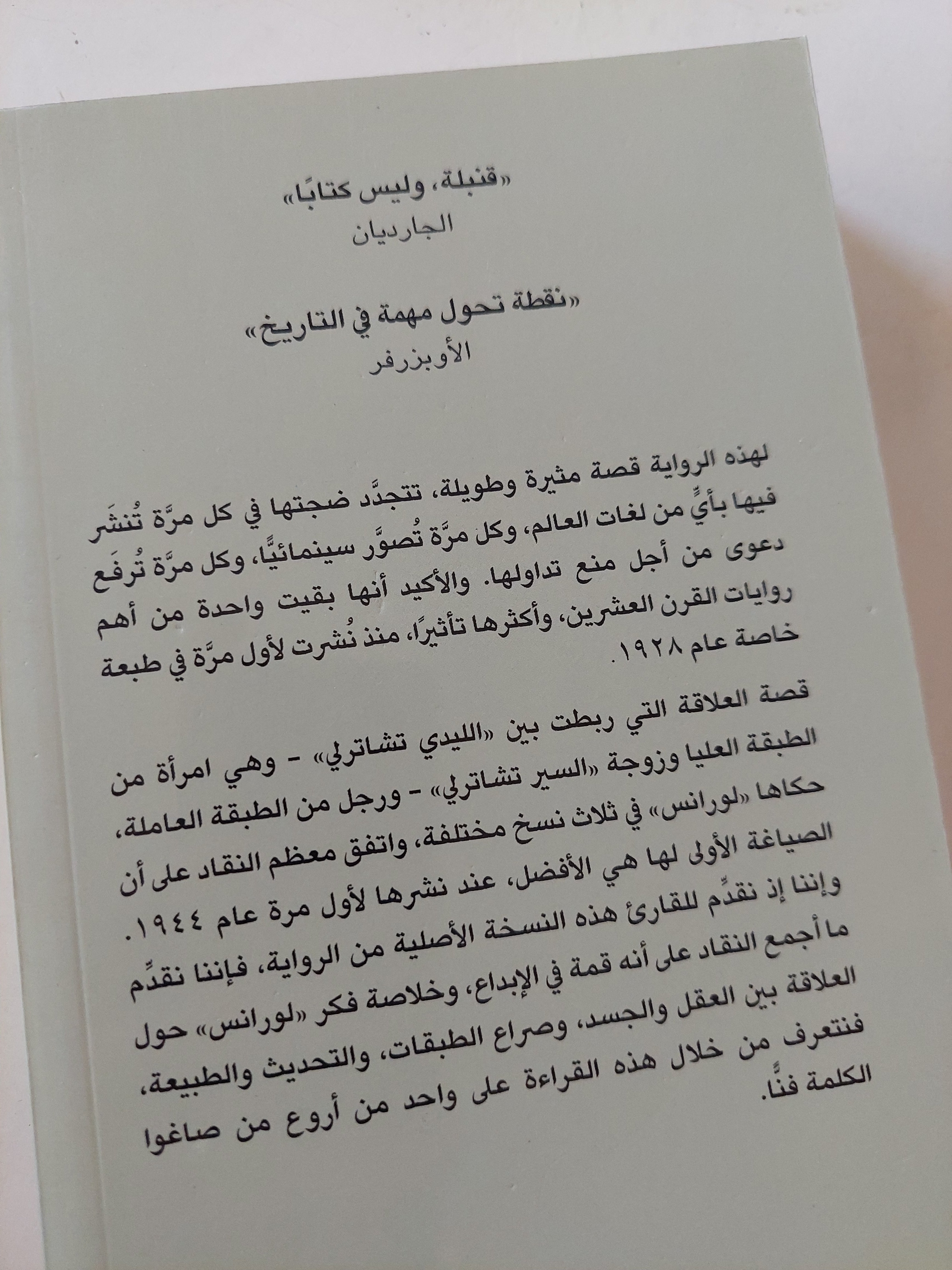 قصة العلاقة الجسدية (والعاطفية) التي ربطت بين «الليدي تشاترلي» – وهي امرأة من الطبقة العليا وزوجة «السير تشاترلي» – ورجل من الطبقة العاملة، حكاها «لورانس» في ثلاث نسخ مختلفة، واتفق معظم النقاد على أن الصياغة الأولى لها هي الأفضل، عند نشرها لأول مرة عام 1944. وإننا إذ نقدِّم للقارئ هذه النسخة الأصلية من الرواية، فإننا نقدِّم ما أجمع النقاد على أنه قمة في الإبداع، وخلاصة فكر «لورانس» حول العلاقة بين العقل والجسد، وصراع الطبقات، والتحديث والطبيعة، فنتعرف من خلال هذه القراءة على واحد من أروع من صاغوا الكلمة فنًّا.